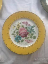 Set di due piatti Seltmann Weiden Bavaria con decorazioni floreali dipinte a mano. - Motivo floreale con rose e fiori misti. - Bordo giallo con decorazioni dorate. - Pezzi unici realizzati a mano.