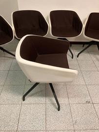 sedia girevole imbottita con braccioli. La struttura interna è in acciaio, rivestita in poliuretano espanso schiumato a freddo. rivestimento combinato in pelle bianca per l'esterno e tessuto marrone per l'interno.