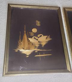 set 2 QUADRI arte orientale realizzati con legno di canna bambu' sagomati, corredati di cornici in legno dorato e vetro , condizioni molto buone con segni di utilizzo accettabili sulle cornici , misura esterna cm 25x30