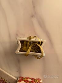 Set di due pensierini a tema natalizio, perfetti per decorare o come piccoli regali. entrambi in ceramica e nuovi. - Uno a forma di busta regalo raffigura due pupazzi di neve con cappelli e sciarpe verdi. - L'altro é una scatolina. è decorato con nastri rossi e dorati che ricordano un pacco regalo. solo spedizione, no consegna a mano