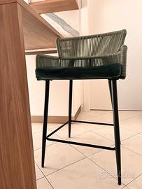 Pack di due sgabelli alti in velluto verde e corda verde (66 cm altezza seduta).