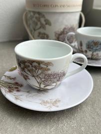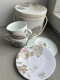 Vendo set composto da 2 tazzine da caffè con relativi piattini coordinati, realizzate in porcellana con elegante decorazione botanica/floreale a fiori e foglie.