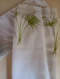 Set due tessuti per fare tende corte. Bianco con leggero motivo a triangolo, con palme verdi, larghi ognuno (come da ultima foto) cm 146, alti cm 76 più un orlo di cm 33, che si può utilizzare arrivando a circa 1 m.