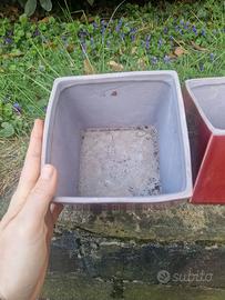 Due vasetti quadrati color bordeaux provenienti da un negozio di fiori