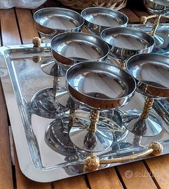 Vendo set di 2 vassoi in acciaio 18/10 con scritta auguri dorato con piuma, 12 coppe in acciaio e manico dorato e 1 caffettiera in acciaio e manico dorato.