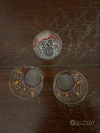 Simpatico set misto composto da 3 bicchieri vintage decorati. Il set include due bicchieri bassi con una vivace fantasia a pois bianchi, bordi rossi e piccoli motivi floreali/fruttati, e un bicchiere alto coordinato con un raffinato decoro floreale rosso e bianco.