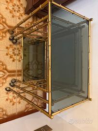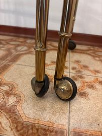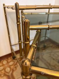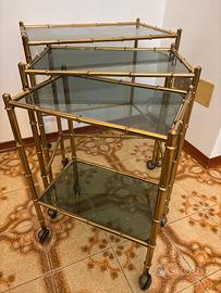 Trittico di carrelli impilabili in ottone finto bambù anni 70 in stile Maison Baguès, struttura in ottone e piani in vetro fume’ dotati di ruote girevoli con supporto in gomma. Presenta leggere inperfezioni legate all'usura. Misura max 51x34 H60