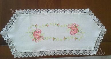 Vendo un set di 3 centri ralizzati interamente a mano a punto croce e rifiniti con pizzo macramè. Misurano: il grande, cm 77x35 i due piccoli, cm 40x26 ciascuno.