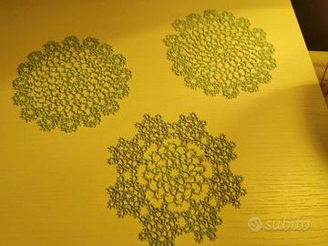 Vendo set di 3 centrini in chiacchierino di colore verde. Ciascuno misura 18 cm