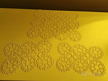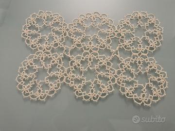 Vendo set di 3 centrini chiacchierino di colore ecru'. Il centrino grande misura 32 cm x 24 cm. I centrini piccoli misurano 25 cm x 16 cm