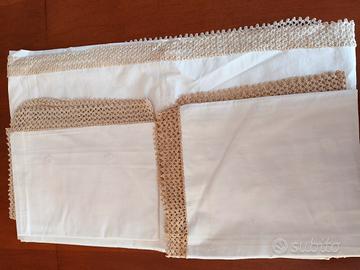 Vendo set di 3 lenzuola in cotone comprese di federe con orlo di pizzo fatto a mano come da foto. Queste lenzuola fanno parte del corredo di mia madre risalente agli anni 60/70.