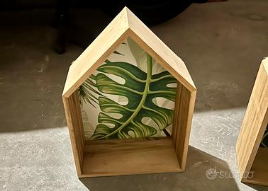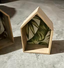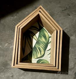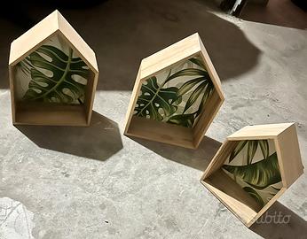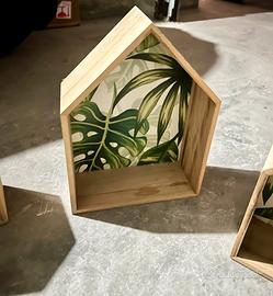Vendo set di 3 mensole decorative in legno dal design moderno e naturale Perfette per arredare casa con un tocco caldo e accogliente. Ogni mensola ha una forma geometrica elegante con interno decorato a fantasia foglie tropicali, ideale per ambienti come soggiorno, camera da letto o angolo relax. ✨ Nuove, mai utilizzate ✨ Stile boho/naturale molto attuale ✨ Perfette anche per idee regalo o home decor Materiale: legno Colore: naturale + stampa verde Quantità: 3 pezzi Utilizzo: decorazione da parete o appoggio