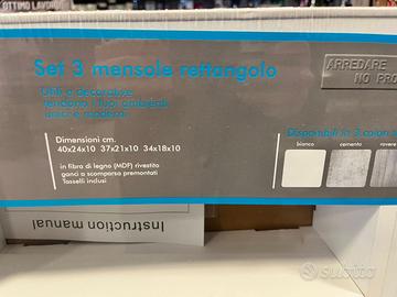 Set di 3 mensole rettangolari, 40x24x10 - 37x21x10 - 34x18x10, in colorazione bianca. Le mensole sono fatte in fibra di legno. Ganci a scomparsa premontati e tasselli inclusi
