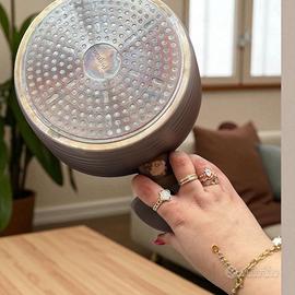Sono state usate con cura, presentano solo lievi segni di normale utilizzo sul fondo esterno (come mostrato in foto), ma l'interno antiaderente è in ottime condizioni e perfettamente funzionale. Perfette per chi cerca qualità e durata in cucina.