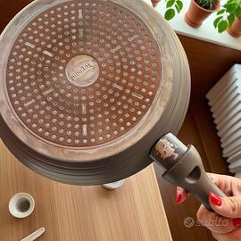 Le padelle presentano un rivestimento interno antiaderente effetto pietra, ideale per una cottura sana con pochi grassi e per una facile pulizia. Il fondo esterno è ottimizzato per una distribuzione uniforme del calore (vedi foto). I manici sono ergonomici e robusti, di colore coordinato.