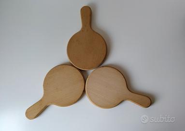 Vendo set di 3 palette/taglieri da cucina in legno. Usati e in buonissime condizioni come da foto. 14 cm diametro 22 cm lunghezza
