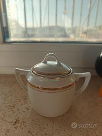 set composto da teiera, zuccheriera e lattiera in ceramica con bordure in oro. non hanno marchio, solo un numero di serie inciso sul fondo di ciascun pezzo. i bordini in oro presentano qualche segno di usura ma nel complesso i 3 pezzi sono in perfetto stato.