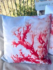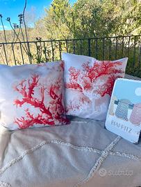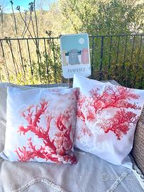 Set federe con stampa di corallo rosso e bianco, accompagnati da una targa decorativa Biarritz. Perfetti per dare un tocco marino alla tua casa in stile coastal/chic - nr 2 federe decorative con fantasia corallo , tessuto poliestere effetto seta, cerniera sul fondo , stampa unico lato, dimensione unitaria cm 45x45 ( imbottituta non inclusa) - Targa Biarritz in metallo con design a tema spiaggia effetto vintage cm 20x30