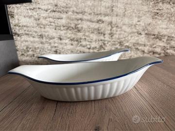 3 pirofile ovali in ceramica bianca con bordo blu.