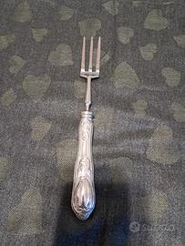 Vendo elegante e raro set di posate d'epoca, composto da un forchettone, un coltello grande da portata e un coltello piccolo (da burro/formaggio). Un vero pezzo da collezione.