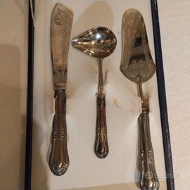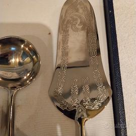 set da portata e/o dessert punzonato bagno argento 800 composto da un coltello, un mestolo/cucchiaio da salsa ed una paletta anch'essa decorata; il tutto disposto nella sua scatola originale ben conservato.