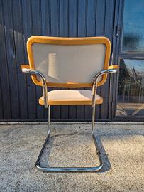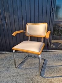 Iconica sedia Cesca (modello B64 con braccioli) disegnata da Marcel Breuer. Un classico del design Bauhaus, presenta un'innovativa struttura a sbalzo in acciaio cromato e cornice in legno di faggio. La seduta e lo schienale imbottiti in skai offrono comfort e stile, combinando l'estetica industriale con materiali caldi. Presentano dei segni sulla seduta come da foto. Marchio Made in Italy presente.