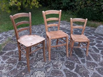 Le sedie sono in condizioni vintage/usate e mostrano i normali segni del tempo e dell'usura, come scolorimenti e piccole imperfezioni sul legno, che ne testimoniano l'autenticità. I sedili in paglia sono in buone condizioni. La sedia con sedile in legno è particolarmente rustica.