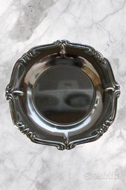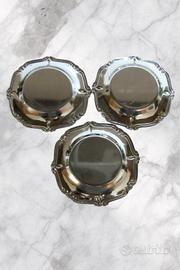 Elegante set di 3 sottobicchieri vintage in metallo argentato, dallo stile classico e raffinato, con bordi decorati.