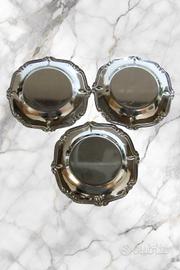 Elegante set di 3 sottobicchieri vintage in metallo argentato, dallo stile classico e raffinato, con bordi decorati.