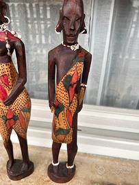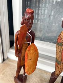 Set 3 statue guerrieri Masai del Kenya in legno intagliato a mano e decorate con perline colorate