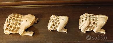 Tre statuette artigianali indiane di rana (lunghe circa cm 8, cm 6,5 e cm 5) in legno naturale (possibile Kadam) intagliate a mano da un unico pezzo di legno, presentano un intricato lavoro di intaglio traforato con la tecnica Jali, che crea un effetto di squame sul dorso, rivelando una versione più piccola della stessa figura all’interno della cavità, visibile attraverso le fessure.