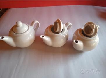 Vendo set composto da 3 piccole teiere (o lattiere) in ceramica bianca lucida, dal design pulito e bombato.