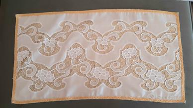 - RUNNER IN PIZZO (65x35 cm) presenta una delicata lavorazione a pizzo con motivi floreali e geometrici, bianco con bordo dorato e fondo beige/giallo (vedi foto) ideale per abbellire tavoli, credenze o comodini. Un pezzo decorativo che unisce eleganza e tradizione artigianale.