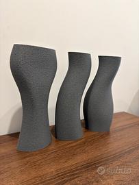 Set di tre vasi decorativi realizzati PLA(plastica), finitura grigio antracite con piacevole effetto ruvido al tatto. Le linee ondulate e sinuose li rendono perfetti per un arredo moderno e minimale: stanno benissimo su mensole, madie e scrivanie, sia singolarmente che in composizione. Ideali come portafiori secchi o semplici oggetti decorativi.