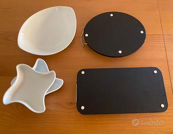 I vassoi sono in ceramica bianca e poggiano su basi in legno nero.