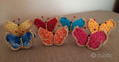 Set 33 farfalle colorate realizzate all'uncinetto da utilizzare come bomboniere o da applicare sulle tende o dove si vuole. Nuove mai utilizzate.