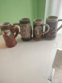 Bellissimo set di 4 boccali da birra da collezione in ceramica/gres, caratterizzati da lavorazioni artigianali con decorazioni in rilievo e finiture lucide. Ogni pezzo racconta una storia e rappresenta una diversa località o tema della tradizione mitteleuropea.
