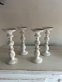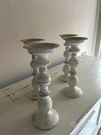 Vendo set composto da 4 candelabri in metallo bianco, effetto decapato, stile shabby chic.