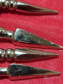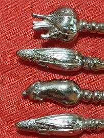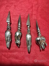 set 4 coltellini per formaggio in acciaio Silver plated con soggetti ortaggi, lunghezza complessiva cm 7, punta cm 4 ottimo stato