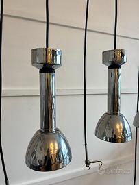 Set di 4 lampade a sospensione in metallo cromato, dal design moderno e industriale. Linee essenziali e finitura lucida, ideali per cucina, isola, tavolo da pranzo, ufficio o locale commerciale.