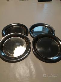 Set di 4 piattini sottobottiglia in acciaio inox 18 /10. Marchio Pintinox Italy. Diametro cm. 14. Articoli nuovi, mai usati. Senza confezione originale. Disponibili a richiesta altri set.