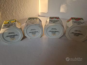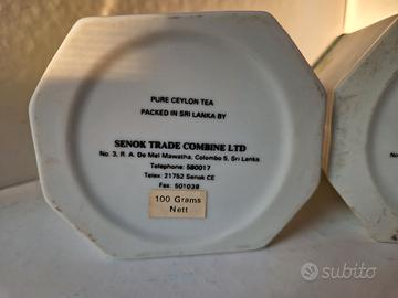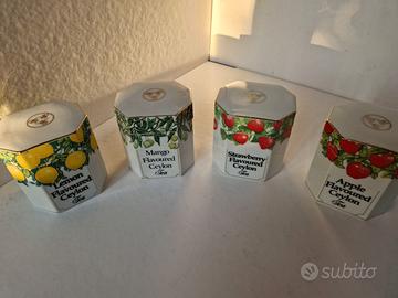 Set di quattro barattoli porta tè in porcellana di forma ottagonale prodotti da Senok in Sri Lanka, decorati con illustrazioni a tema frutta. La serie comprende i modelli dedicati ai gusti limone, mango, fragola e mela, tutti caratterizzati da coperchi coordinati con disegni di foglie e frutti. Ogni contenitore ha una capacità originale di 100 grammi e riporta sul fondo i dettagli della produzione e la provenienza. Gli oggetti si presentano in ottime condizioni di conservazione, non mostrano sbeccature o segni di usura evidenti e mantengono la brillantezza della ceramica e dei colori. I barattoli vengono venduti vuoti e risultano ideali per un utilizzo pratico in cucina, per conservare bustine di infusi o semplicemente come elementi decorativi vintage. La particolare forma geometrica e le dimensioni uniformi consentono di affiancarli in modo ordinato su mensole o ripiani.