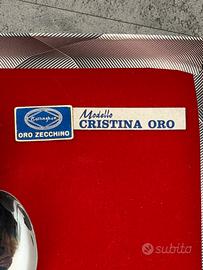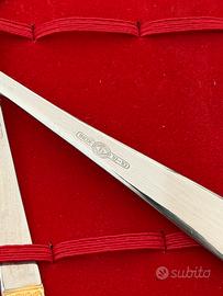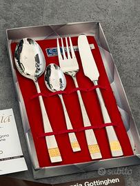 Bellissimo set singolo da tavola “Cristina Oro” della storica marca italiana Gottinghen (Articoli Casalinchi S.r.l. - Gottigen, Brescia). Contiene: • 1 coltello da tavola • 1 forchetta da tavola • 1 cucchiaio da tavola • 1 cucchiaino da caffè Materiale: Acciaio inox 18/10 di alta qualità con manici laminati in oro zecchino 24K con raffinato decoro geometrico. Elegante e raffinato, perfetto per tavola di gala, occasioni speciali o come regalo di nozze/battesimo. Condizione: Nuovo, mai usato, ancora nel cofanetto originale con inserto rosso e nastro rosso. Garanzia originale inclusa (vedi foto). Posate perfette, senza graffi o segni di utilizzo. Scatola in ottime condizioni.