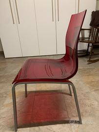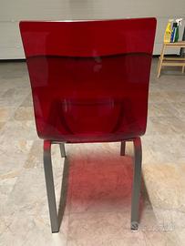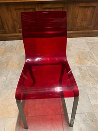 Vendo set di 4 sedie moderne in plastica rigida rosso trasparente, con gambe in metallo satinato. Design contemporaneo, ideale per cucina, sala da pranzo o ambienti dal gusto moderno.