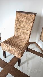 4 sedie da pranzo in vimini/rattan.Presenta una struttura interamente rivestita con un intreccio di banano naturale e gambe in legno scuro.