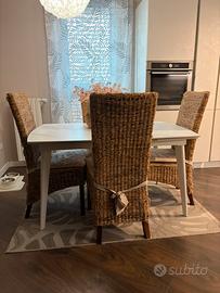 Vendo set di 4 sedie in corda di banano intrecciata, stile naturale/boho chic, con struttura in legno e cuscini inclusi.