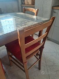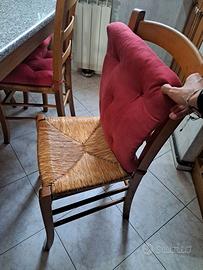 Vendiamo set di 4 sedie in legno e vimini. L'acquisto prevede la vendita di tutte e 4 le sedie - restiamo a vostra a disposizione per qualsiasi altra richiesta. Alcune portano qualche segno estetico, ma sono tutte e 4 rinforzate al di sotto per una tenuta bella robusta. Il materiale è di un ottimo legno, in generale sono tutte tenute bene. Il tavolo è in vendita in un altro annuncio. Grazie!