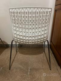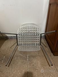 Vendo 4 sedie moderne in ottime condizioni, con seduta e schienale in plastica resistente bianca a griglia e gambe in metallo cromato.