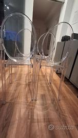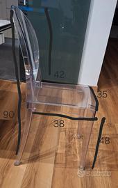 Set 4 sedie in policarbonato trasparente. leggere ma perfettamente stabili, ben conservate anche se presentano qualche segno superficiale. Ritiro a Cormano.