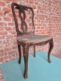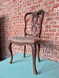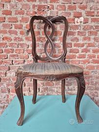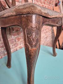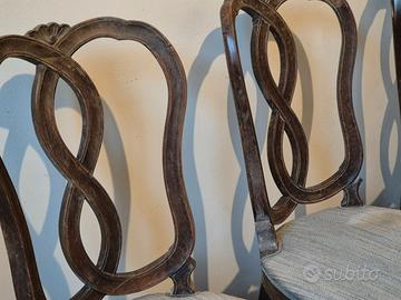 Set di 4 bellissime sedie dei primi del Novecento in Stile Veneziano, con seduta imbottita e struttura in legno di noce intagliato. La linea elegante e le dimensioni generose (seduta larghezza cm 48 e altezza cm 45, schienale altezza cm 97) le rendono perfette per la vostra sala da pranzo o per la sala riunioni del vostro studio professionale. Condizioni generali discrete. Si rendono necessari la pulizia delle parti lignee ed il ripristino di imbottitura e rivestimento della seduta.